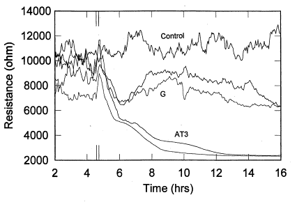 上圖分別是加入G細(xì)胞、AT3細(xì)胞和對照的內(nèi)皮細(xì)胞層阻抗曲線。可以看到隨著腫瘤細(xì)胞的加入,內(nèi)皮細(xì)胞層阻抗值開始降低,并且AT3細(xì)胞引起的降低更加顯著,阻抗值降低的原因是由腫瘤細(xì)胞的侵入影響了完整的內(nèi)皮細(xì)胞層。